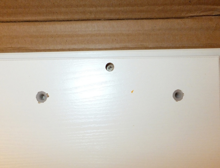 Выдвижные ящики внизу стола встали криво, отмечу, что отверстия были просверлены заводом-изготовителем, но видимо у них погрешность измерений достаточно большая и первоначально выглядело вот так: