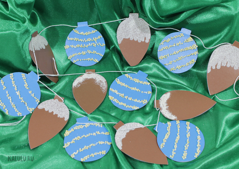 Продолжаем готовить новогодние поделки. Картонные заготовки для гирлянды можно украсить узором из пшена или манки. Подробности под катом...