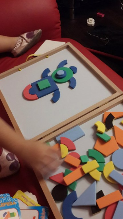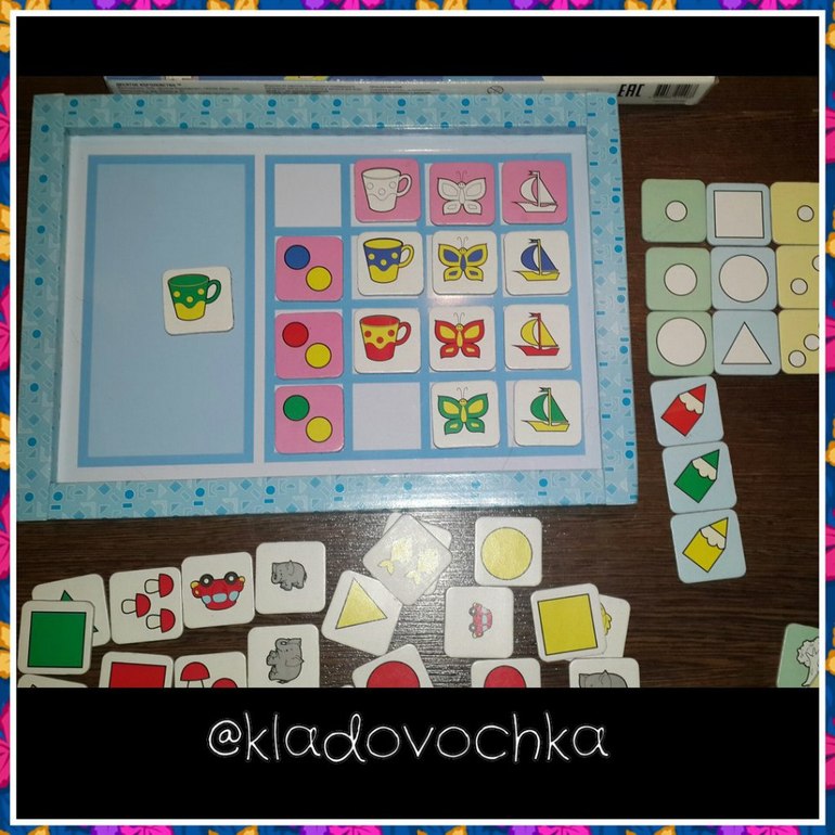 Магнитная игра с заданиями на цвет, форму, количество, больше-меньше, в комплекте 60 карточек. Игру мы освоили очень быстро и перешли на 4+. Можно докупать дополнительные карточки на 4,5,6 лет
