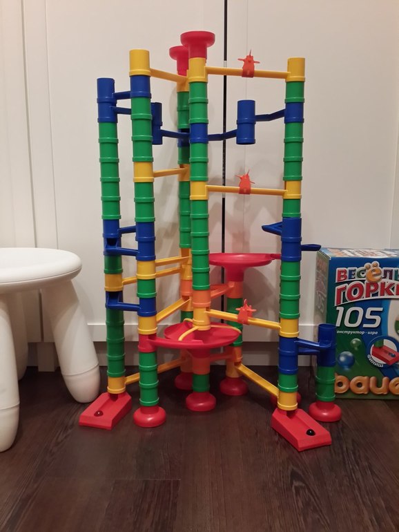 Очень увлекатальная игра с простыми правилами: нужно тянуть палочки в соответствии с цветом на кубики, пока вся конструкция не рухнет. Мы весь вечер играем всей семьей. На коробке написано 4+, но играть можно гораздо раньше.