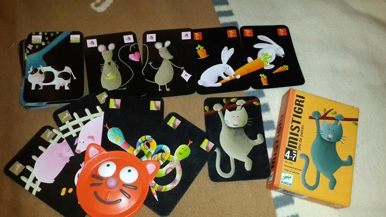 Колода состоит из 33 карт, 32 парные карты и одна карта "Мистигри" с изображением котика. Выбирая по одной карте из карт соперника слева необходимо собирать пары и выкладывать их, и к окончанию карт не иметь на руках карту "Мистигри". Тоже любимая игра. Такую игру можно сделать самостоятельно, использую игру мемо, просто убрав одну карточку