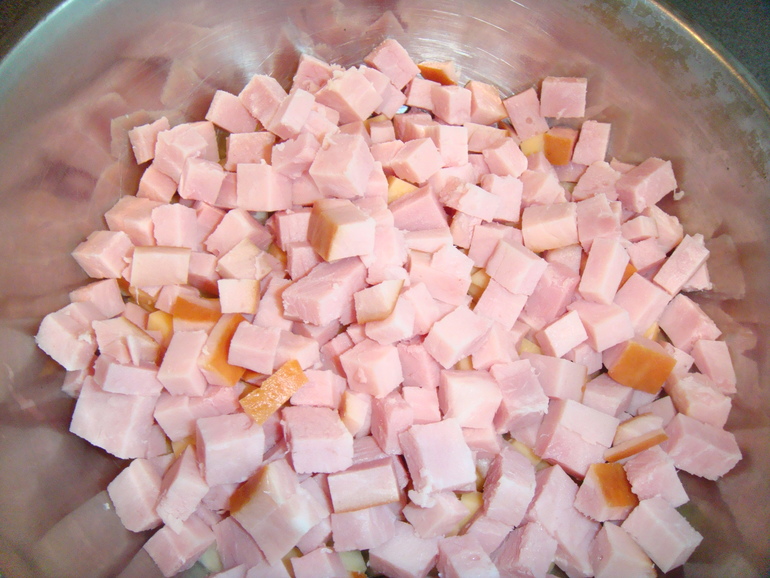Нарезать кубиками ветчину: