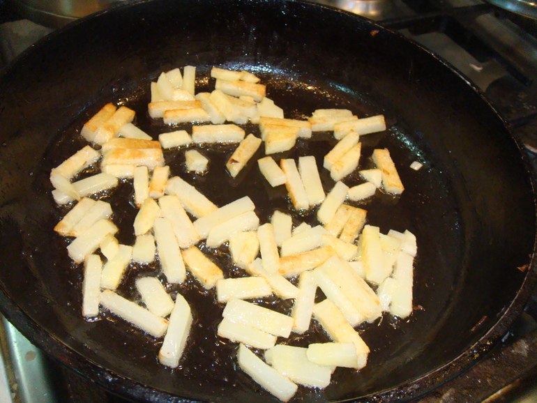 Нарезать картошку тонкими брусками и обжарить с солью до готовности: