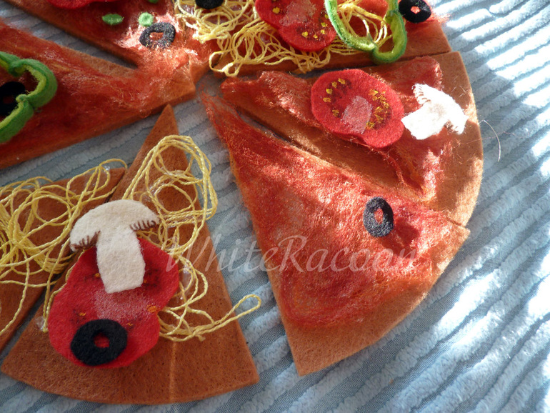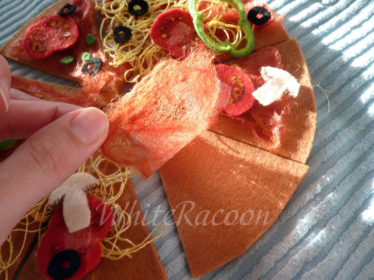 Секрет соуса: Обернуть кусок пиццы целлофаном (пакетом). Взять красную шерсть (гребеная лента, которая для валяния), порвать на кусочки и выложить соус на куске. Потом смазать жидким клеем, который высыхает прозрачным (можно пва, можно полимерный). Высушить, снять, играть. Чудесно липнет к фетровой основе, очень тонок, полупрозрачен, и даже несколько натуралистичен %)