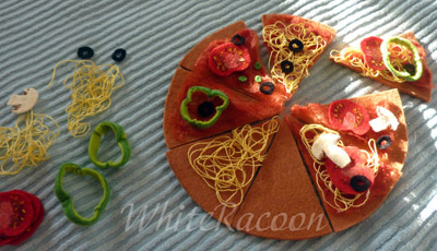 Игрушечная пицца из фетра. Наверняка, вы не одну такую видали, да я и не стала б показывать, если б не одно но. Все пиццы, что я видела, состояли из хорошеньких фетровых деталек, пухленьких двусторонних: сыр куском, соус шматком... А у нас в семье принято соус тооонко размазывать, а сыр сверху тереть в ажурную корочку. Пришлось изобретать.