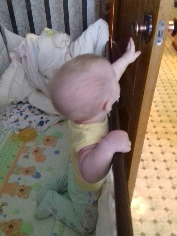 Начали вставать у опоры, но пока на коленях, очень хочет встать на ножки, но пока рано, не получается