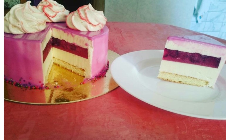 Торты на заказ Одинцово (Армине) → Новенькая Спам Мама двоих (14 лет, 10 лет) Одинцово Муссовый торт с ванильным бисквитом, вишневым конфи и зеркальной глазурью 😉