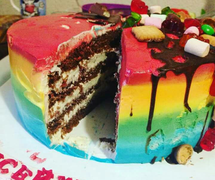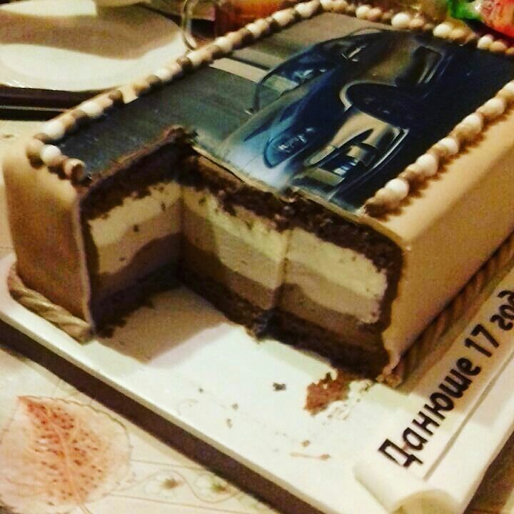 Внутри шоколадный бисквит с кремом пломбир а сверху масляной со сгущенным молоком 🌈