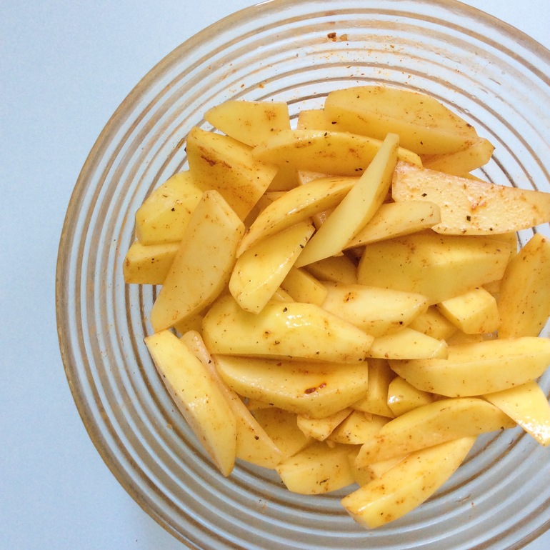 Пока берем картошку, дольками ее, еще чуть масла, паприки и соли. И в микроволновку минуты на три.