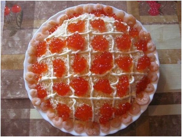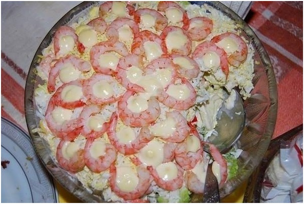 ●для украшения сверху яйца куриные терла, креветки, майонез,