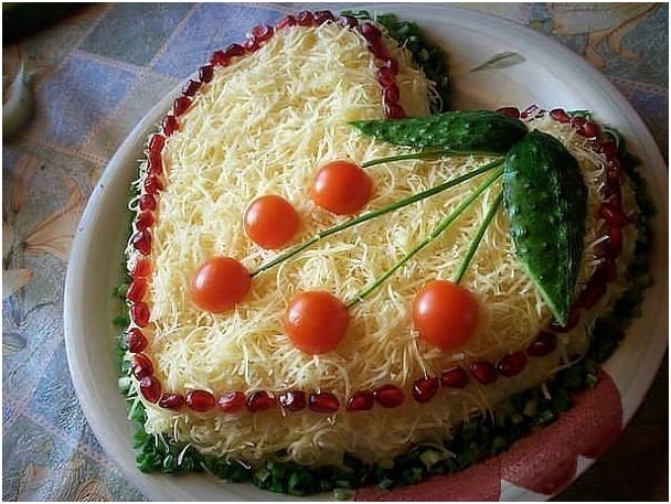 5. Украшение сверху: помидоры- мелко порезанные, огурцы - соломкой +укроп, сыр - на терке, маслины.