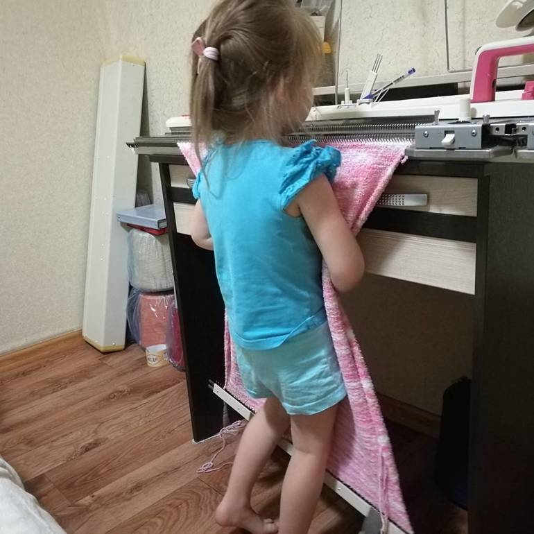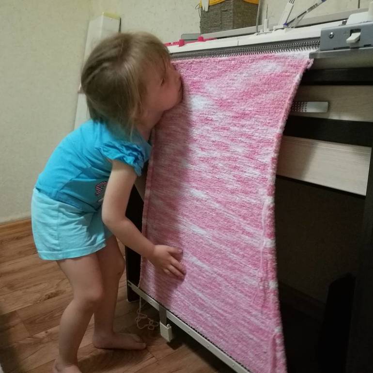 Вяжу для дочи плед. Пряжа очень мягонькая, плюшевая. Дочь всё вертится рядом, а как я отошла от машины взять ещё один моток, то она и так и сяк, обнимается с полотном, щекой прижимается, такая лапочка. Даже пыталась стащить с машины. Милота.