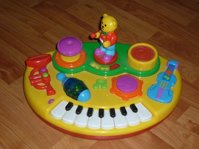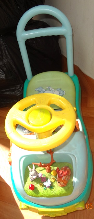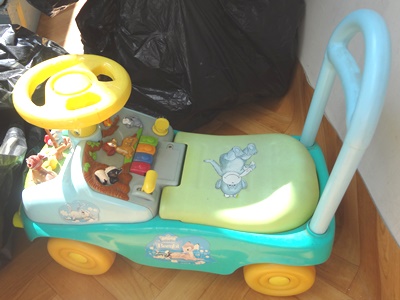 П.8 Машинка-каталка для малыша. Низкая, подойдет для совсем маленького. Есть звуковые эффекты (завод двигателя, сигнал, разные мелодии). В сиденье багажник. Состояние рабочее. Выцвела и запылилась на балконе. В остальном дефектов нет.