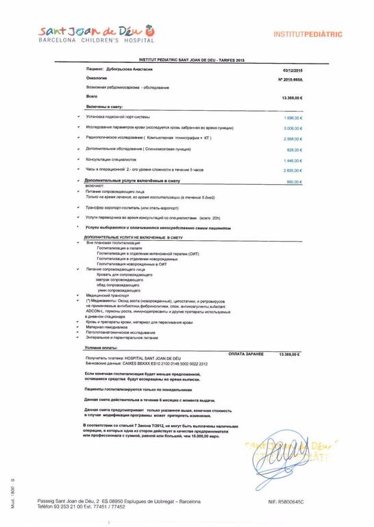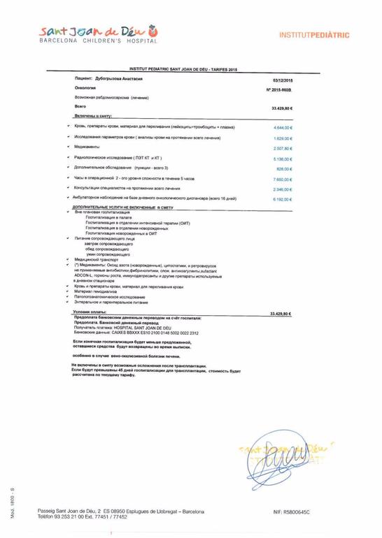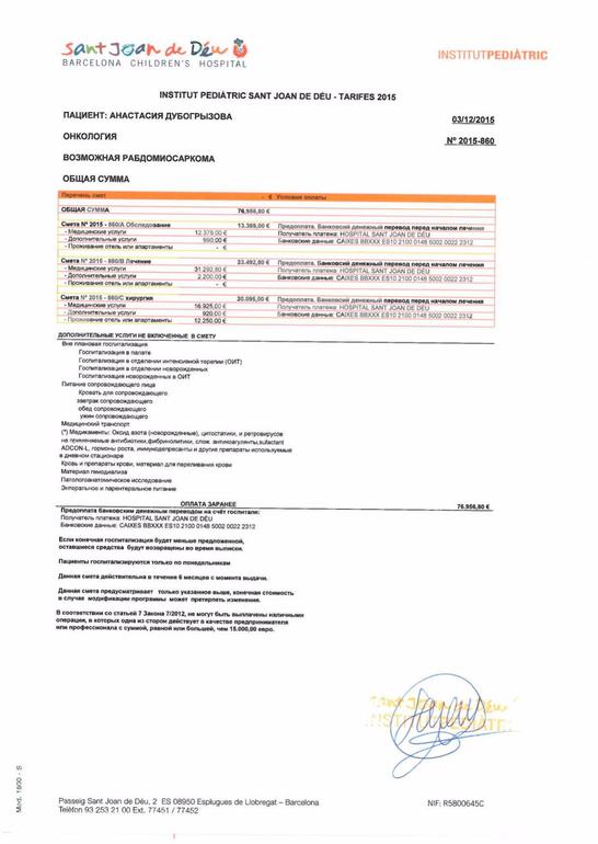 Госпиталь Сант Жоан де Деу (Hospital Sant Joan de Deu),Испания,Барселона! Сумма к сбору- 80 000евро ( примерно 6 240 000 р по курсу 78/1) В сумму включено: 76 956,8 евро. по счету+ 3043,2 евро на доп.расходы.