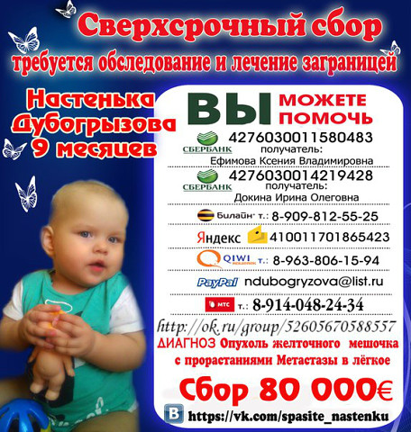 Настенька Дубогрызова 9 месяцев! РАК!!! ПОМОГИТЕ МАЛЫШКЕ!!