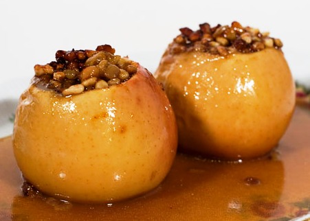 Тыкву мелко нарезать, смешать с мелко рубленными грецкими орехами, медом и хлопьями. Начинить яблоки и поставить в духовку при температуре 180 градусов на 20-30 минут. В форму на дно налить чуть-чуть воды. В яблоки можно добавить по полчайной ложки сливок или молока.