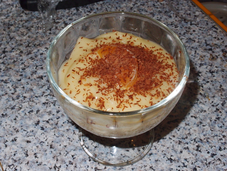 Теперь берем порционные креманки. Савоярди макаем в кофе и выкладываем на дно креманки. Сверху - дольки мандаринок. Далее выкладываем заварной крем. И так еще столько раз, чтобы заполнить креманку. Украшаем дольками мандаринок и посыпаем тертым шоколадом. Закрываем пищевой пленкой и ставим в холодильник на несколько часов.