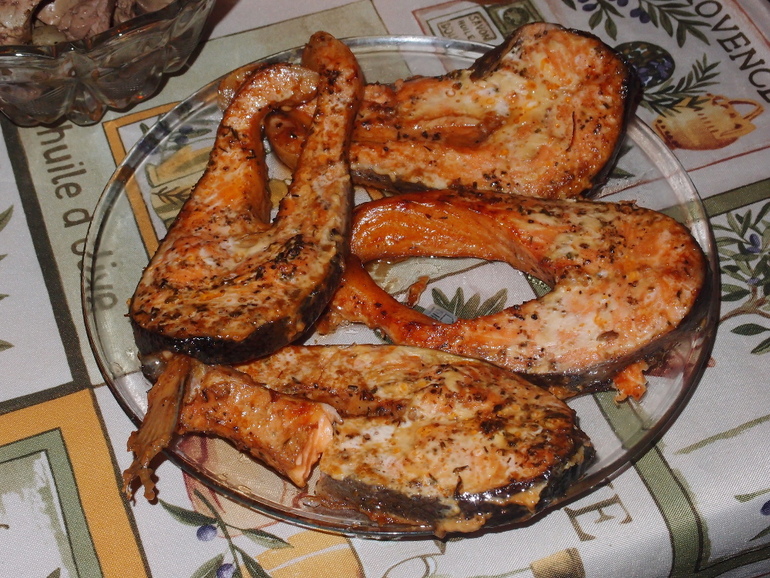 Стейки рыбы выкладываем в емкость, поливаем соевым соусом, посыпаем специями, сбрызгиваем лимонным соком. Накрываем крышкой и оставляем мариноваться на полчаса. Затем форму для запекания смазываем растительным маслом, выкладываем стейки, сверху поливаем оставшимся маринадом, добавляем ½ стакана воды. Запекаем 40 минут при температуре 180 градусов.