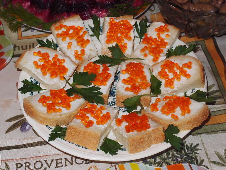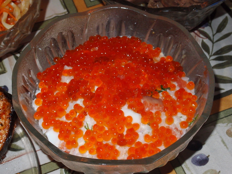 Ингредиенты: красная рыба домашней засолки отварной рис яйца зелень икра для украшения майонез