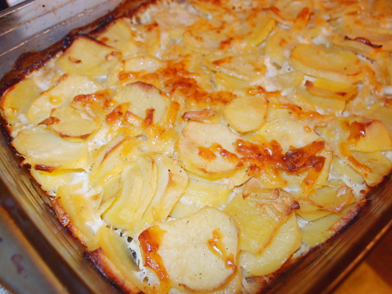 Приготовление: Форму для запекания смазать растительным маслом. Выложить в 2-3 слоя картофель, нарезанный кружочками. сделать заливку. Для этого немного взбиваем молоко с яйцом, добавляем измельченный чеснок, сыр, соль и мускатный орех. Перемешиваем и заливаем картофель. Запекать до румяной корочки при температуре 190 градусов.