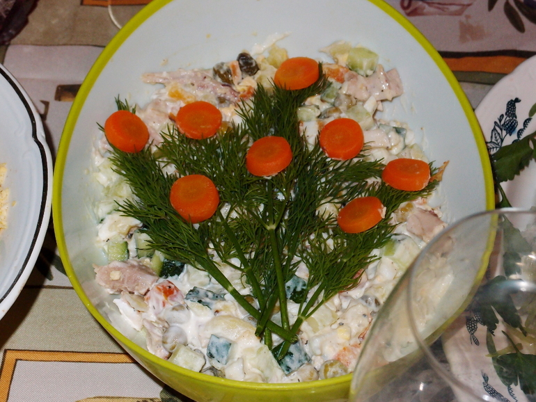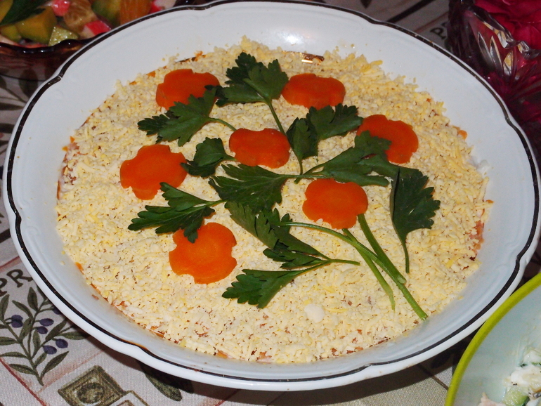Выкладываем слоями, каждый слой промазывая майонезом:
