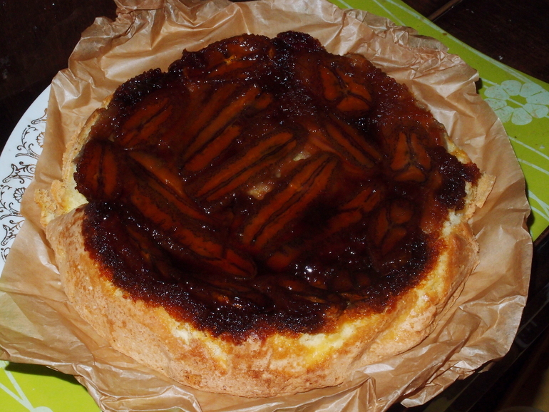 Форму для запекания застилаем бумагой для выпечки. Сразу же после приготовления карамели выливаем ее в форму. Это делаем быстро, пока она не застыла. На карамель выкладываем бананы, а сверху выливаем тесто. Выпекаем 45 минут при температуре 180 градусов.