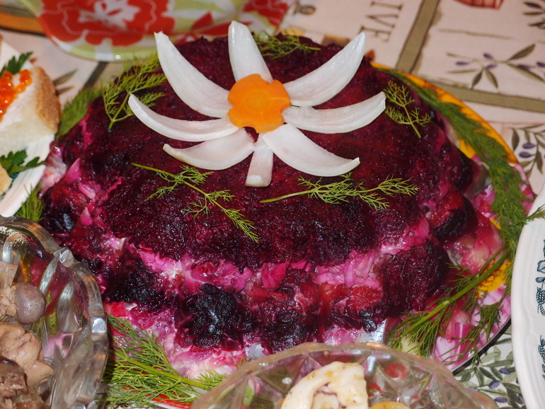 8 слой - свекла, натертая на мелкой терке и смешанная с майонезом.