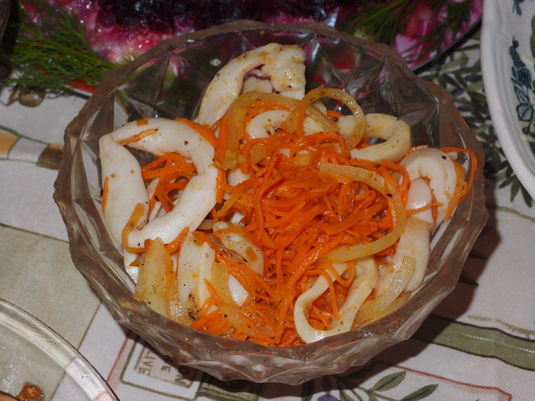 Лук нарезать полукольцами, а морковь натереть на терке. Морковь посыпать солью и оставить на 10-15 минут. Морковь соединить с луком, кальмарами, специями и заправить растительным маслом и уксусом. Перемешать и поставить на ночь в холодильник.