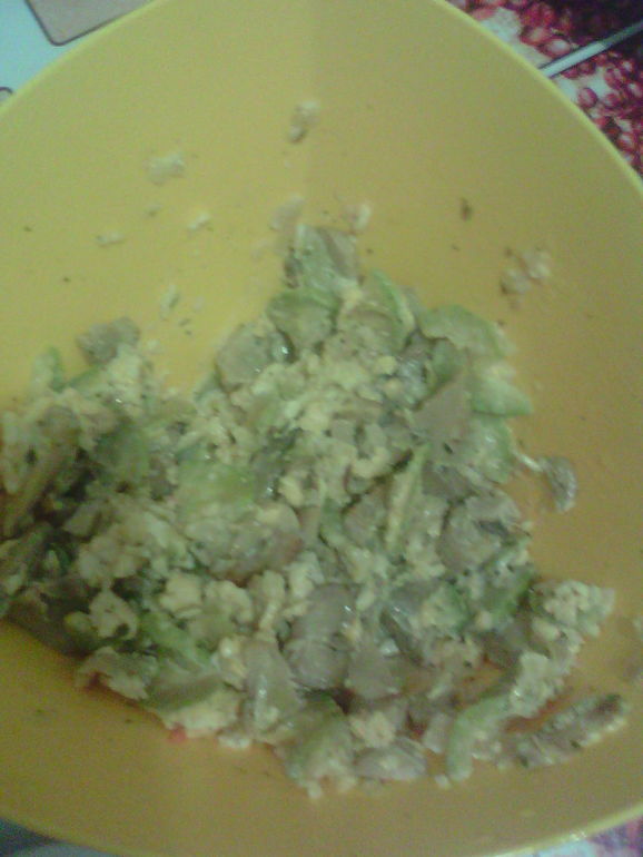 Режем кабачки круг на 4 части и обжариваем на сковороде, далее вбиваем яйца и мешаем