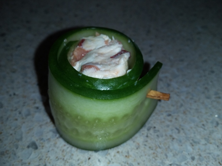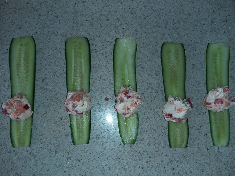 Разложить ломтики огурца. Выложить по 1 ч.л. массы: