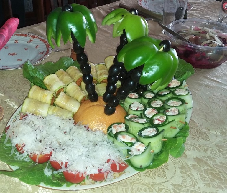 В последний день готовила прощальный обед: роллы из огурца, кабачковые рулетики, помидоры с чесноком и сыром, креветки якитори, солянка мясная сборная, котлеты по-киевски, пирожки с картошкой, фруктовый остров. Новые блюда покажу пошагово.