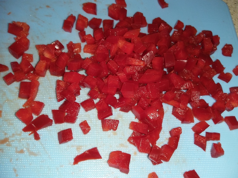 Нарезать мелким кубиком болгарский перец (лучше смотрится желтый, но у меня не было):