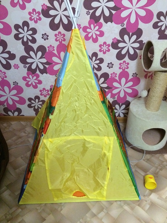 Очень я хотела скорее его собрать и поручила это дело мужу. Не так то просто было собрать эту палатку. Ткань постоянно сползала и в итоге даже пришлось фиксировать скотчем. И вот...Не шедевр, конечно.