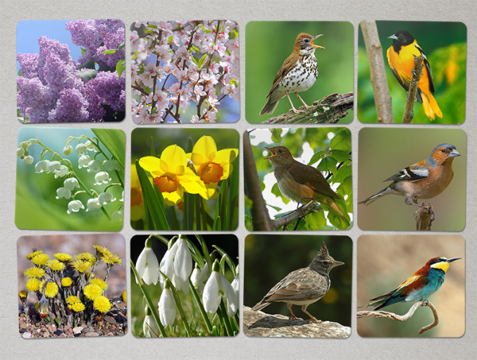 Следующая игра так же на поиск соответствия и группировку. Здесь есть 4 весенние темы: листья, бабочки, весенние цветы и певчие птицы, по 6 картинок в каждой. Я предлагаю распечатать картинки, разрезать по контуру, перемешать и искать поочередно картинки из каждой тематики. Я распечатывала все эти картинки на двух листах А4.