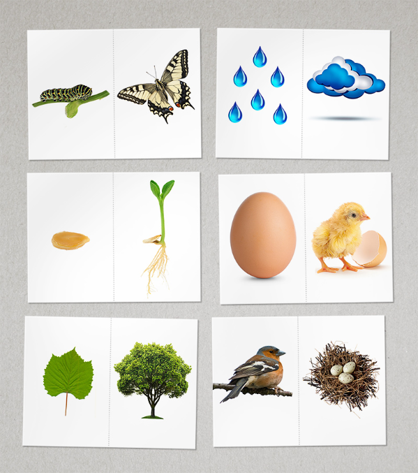 Эти карточки на взаимосвязь. Сначала мы их просто изучаем, я рассказываю, как две картинки связаны друг с другом. Через пару дней карточки можно разрезать по пунктиру, перемешать и попросить найти пары.