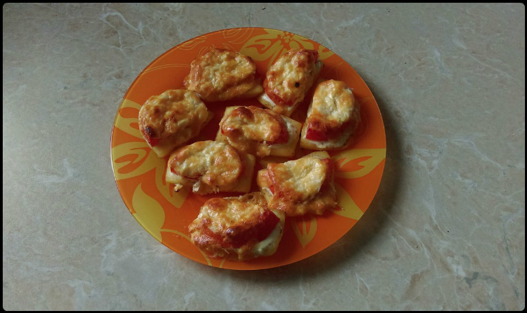 Сверху режем помидор и всё посыпаем тёртым сыром.