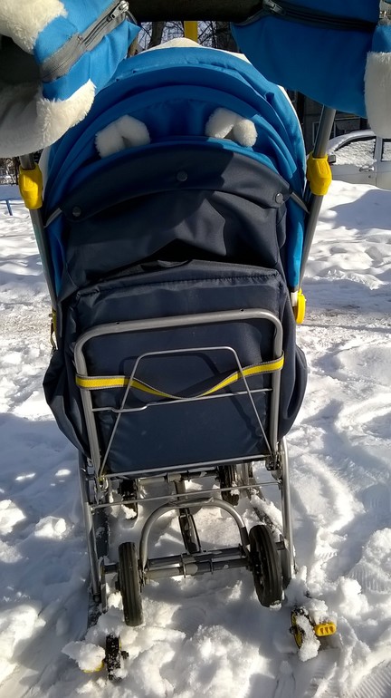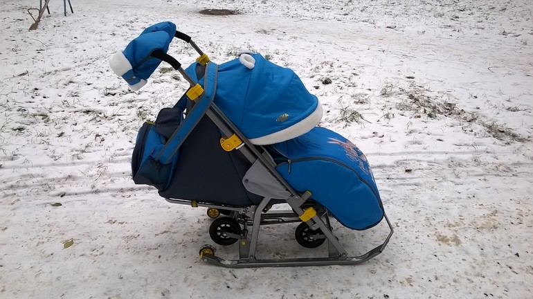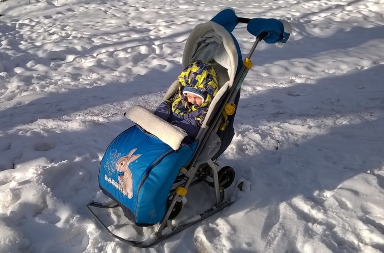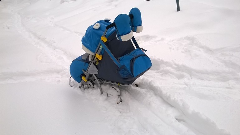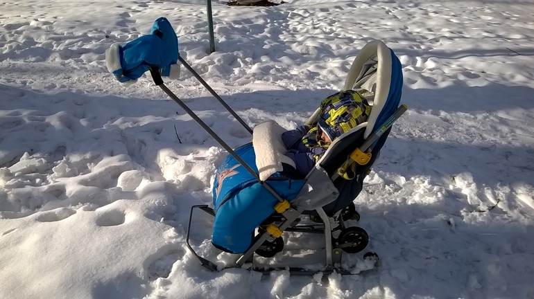Когда в октябре случилась репетиция зимы с обильным снегопадом, наша люлька Зиппи Верди 3 в 1 меня разочаровала. По снегу даже на надувных колесах проехать было очень трудно. Да и вес коляски с каждым месяцем раздражал все сильнее (прогулочный блок оказался узковатым и еще тяжелее люльки). Поэтому на зиму было решено приобрести санки-коляску, торжество российской смекалки.
