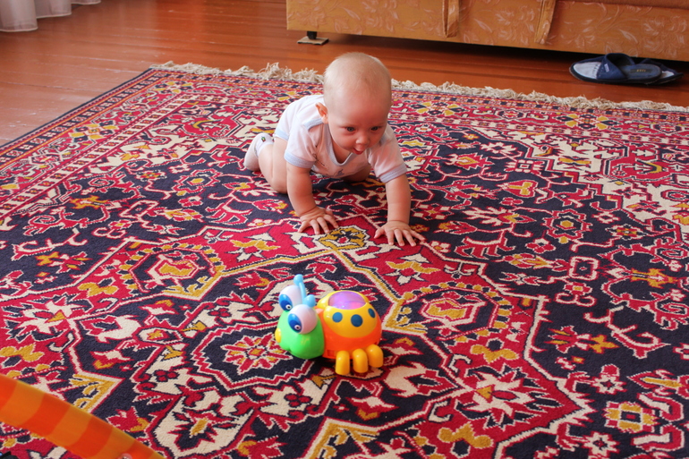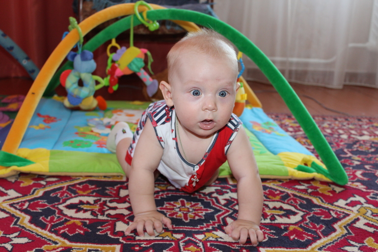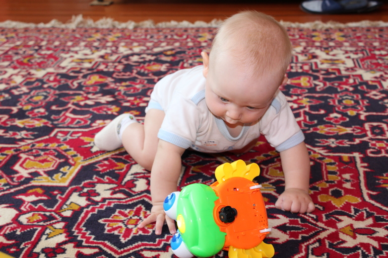 В развитии наш Егорка не стоит на месте, каждый день выдает что-нибудь новенькое. Итак, за 5 дней до 6 месяцев пополз по-настоящему, так что ровно в шесть уже уверенно рассекаем просторы, поэтому малыша ни на минуту оставить в комнате одного нельзя. Лезет везде, интересует все кроме его игрушек, хотя до этого момента просто обожал с ними играть. Сейчас появился просто жуткий интерес к пульту от телевизора, сплит-системы, родительскому телефону, маминым тапочкам, проводу от колонки. Пришлось максимально малыша изолировать от этих предметов. Придумал себе такую игру: бросает игрушку, быстро до нее доползает, опять отбрасывает и так может долго себя занимать.