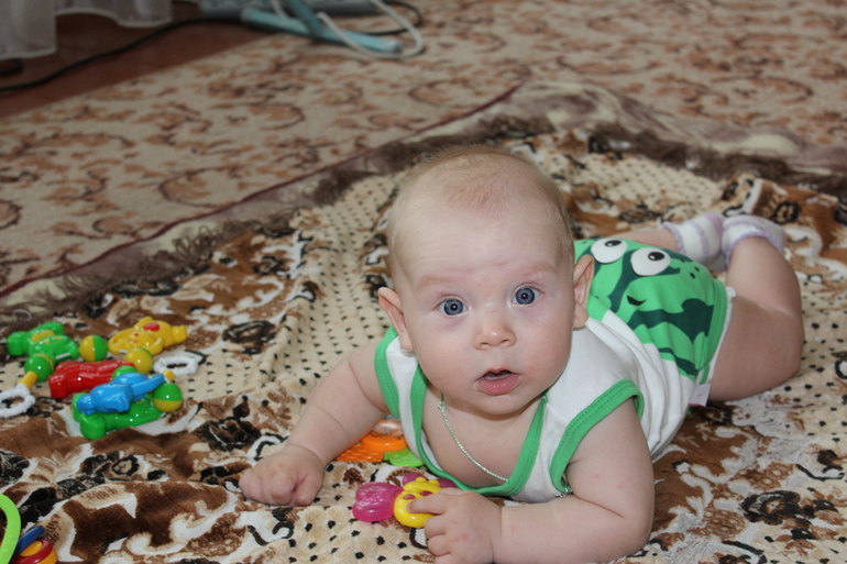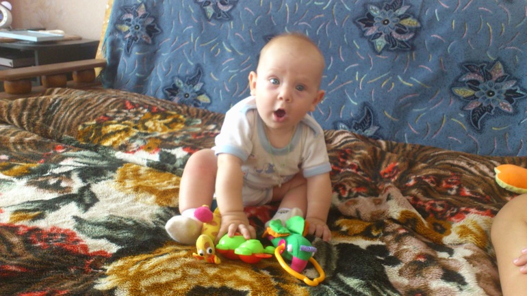Переворачивается в обоих направлениях - со спины на живот чаще, очень любит лежать на животе, крутится вокруг своей оси, таким образом быстро перемещается с одного края на другой. Появились первые попытки вставать на четвереньки, так и раскачивается вперед-назад, пытается ползти, но получается пока только назад. Так смешно наблюдать за ним, пытается достать игрушку, но, отдаляясь от нее, начинает, конечно, возмущаться. К игрушкам относится с большим интересом, свободно берет в руки, перекладывает с одной руки в другую, естественно, все пробует на вкус. По настроению может долго занимать себя, а может и с рук не слазить. Много и подолгу "разговаривает", появились некое подобие слогов: амама, бубыбы,гигигу и тд. Особенно, когда что-то не нравиться, более отчетливо их проговаривает. С интересом рассматривает кошечек, собачек, тянется всем корпусом, чтобы потрогать, но здесь мама категорична, пока общаются только на расстоянии. Очень любит играть в " Мишку косолапого" (ложусь на спину, а Егорку ставлю на свой живот), ездить по кочкам и падать в ямку, недавно рассказывала сказку "Колобок" (в том же положении-лежа), чем эмоциональней играешь с ним, тем больше эмоций получаешь в ответ. Невероятное удовольствие ребенок получает от прыжков на руках, но долго я их выдержать не могу, вес-то уже немаленький. Достала картонные небольшие книжки, доставшиеся от старшенького, пока только рассматривает и пытается попробовать на вкус.