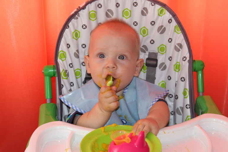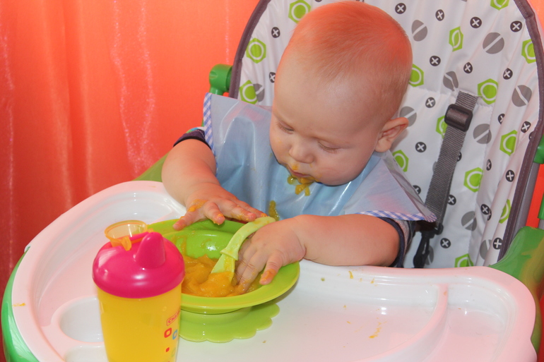 С шести месяцев начала вводить прикорм. Дня четыре давала кабачок, очень понравился. Следующая на столе оказалась цветная капуста, ребенку не понравилась ( рот практически не открывал, а языком пытался вытолкнуть ложку). Помучила дня два и решила на следующий дать ассорти из трех овощей: кабачок, цветная капуста, морковь. Такой расклад очень понравился, съел с удовольствием. Все пюрешки готовлю сама на воде и без соли, перемалываю в блендере или перетираю через сито. На полдник начала давать яблочко, сваренное на пару, тоже ест с удовольствием. Решила предоставить ребенка самому себе, вот что из этого получилось. Естественно все было в пюре, как говорится, по усам текло, а в рот не попало. Наверное, нашу самостоятельность придется перенести на попозже. Полностью кормление еще не заменяю, все равно предлагаю грудь. Стул нормальный.