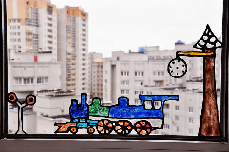Кстати за витражиком видно нашу застройку и становится понятно в каких каменных джунглях мы живем, и почему Иван не любит выезды на природу. Честно было тяжело, и финансово, и идейно. Для мальчиков железнодорожников очень мало чего есть, все упирается в основном либо в цену (на амазоне лампа-ночник выходила 8500 тысяч), либо в большие наклейки на стену. Но кто ищет тот найдет ;-)