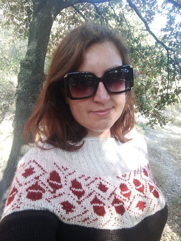 А потом, набравшись смелости, я приступила к взрослому варианту, себе. Началось с того, что исходный рисунок жаккарда никак не вмещался в мой размер, я решилась его подкорректировать, и нарисовала свою схему, оставив желуди. Потратила 2 вечера.