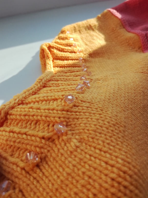 Свитер вышел "по мотивам", я не брала косички на горловину, а сделала резинку 2х2, и пришила бусины, немного на солнце поблескивают.