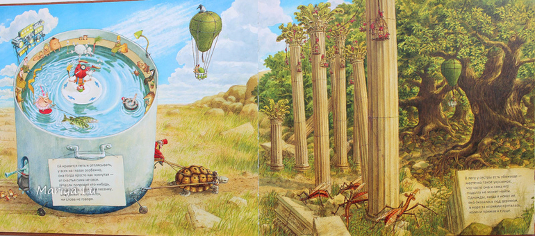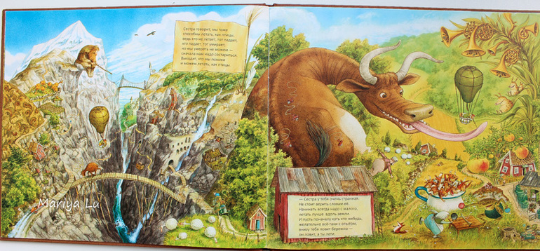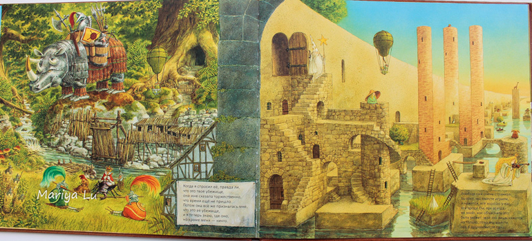 Потом Никита стал просить читать, позвал меня с собой в этот мир. Он рассказал про королей и носорогов, боевых улитках, рассыпающемся небе , жирафах на пастбищах в горах , тайных ходах и растениях- музыкантах и многом другом. Иногда сын хотел просто слушать стих, иногда мы смотрели развороты без текста. А еще он стал декламировать отрывки стиха, достаточно сложного на слух и восприятие, кстати.