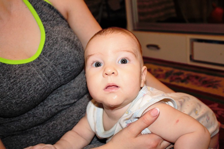 Пытается: сесть, держать бутылку (почти получается), повторять звуки (особенно мама - видно как губами шевелит).