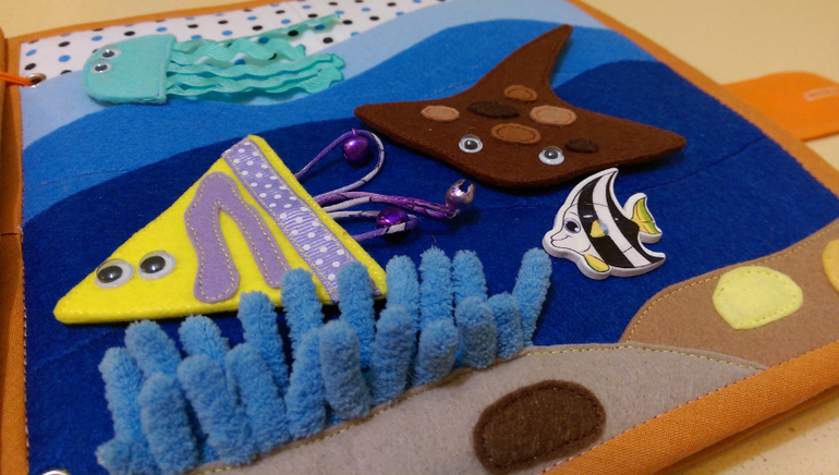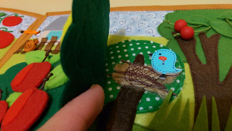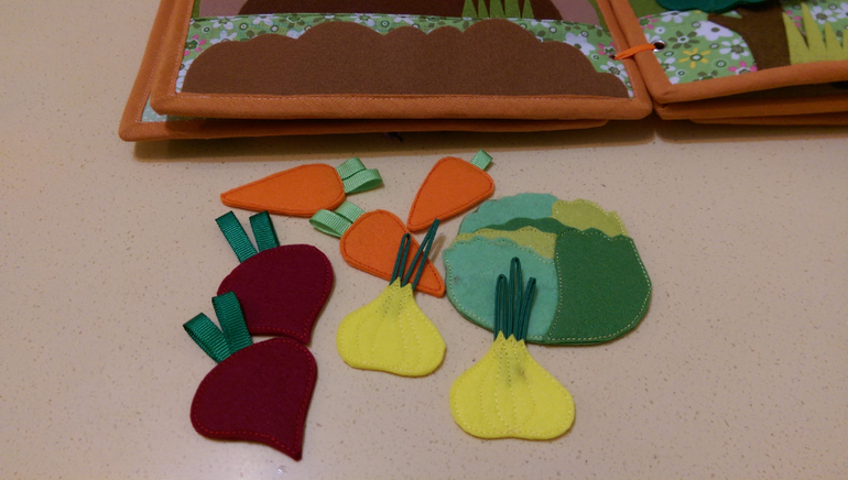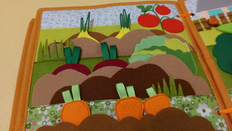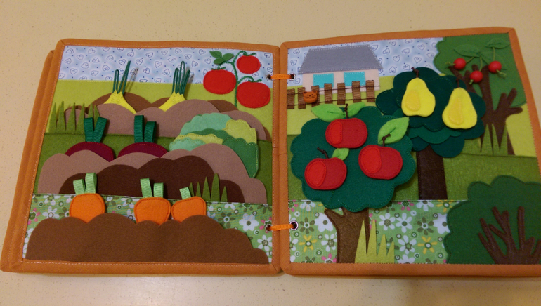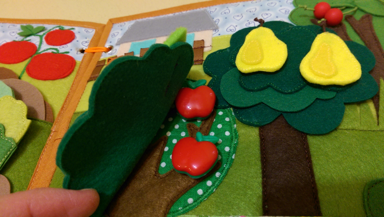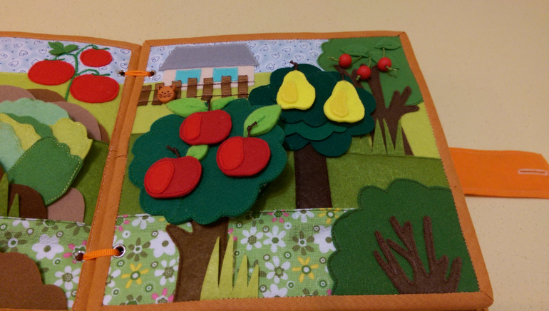 2) Сад-огород. Знакомимся с некоторыми овощами и фруктами. Овощи складываем в импровизированные карманы, фрукты на липучке.