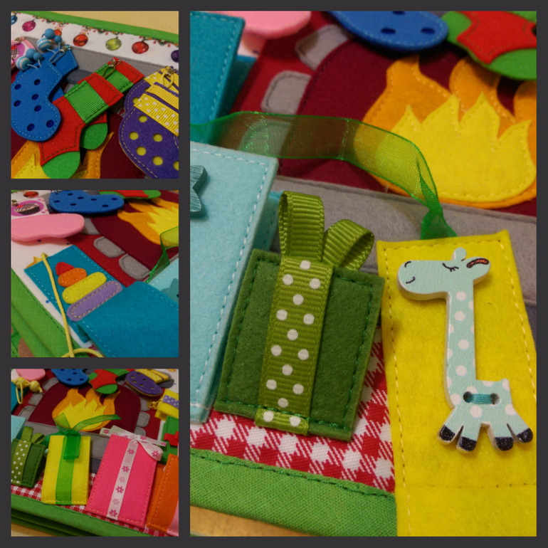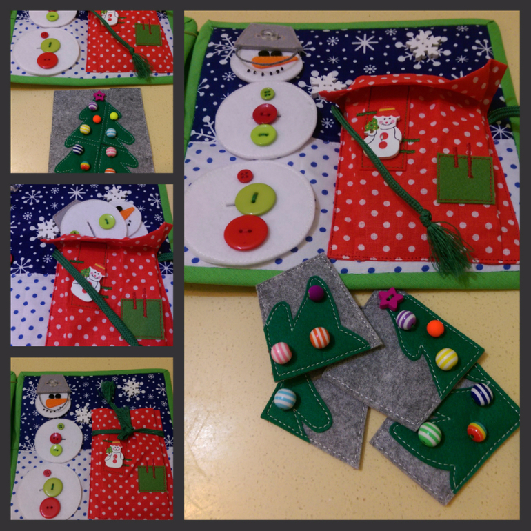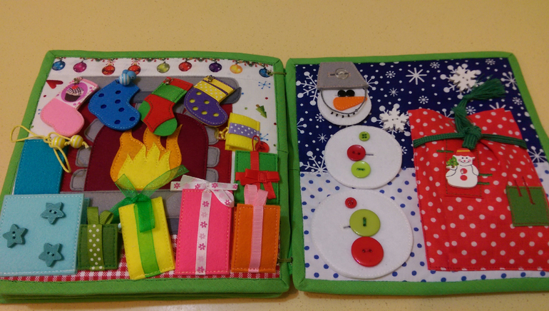 Камин завален подарками, которые интересно открывать( игра найди одинаковые) и найти пару носочкам(вешаем на крючки). Любимый снеговик( на пуговицах), рядом мешочек, в котором пазл.