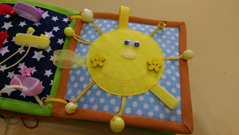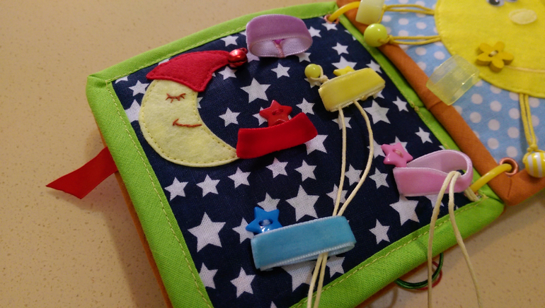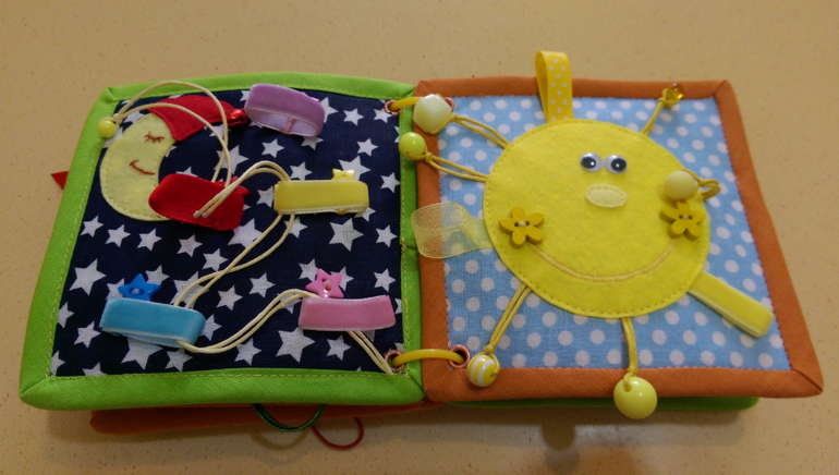 День и ночь. Тренируем пальчики, просовываем шнурок. У каждой звезды своя "дверь"(бархатная, приятная на ощупь). У солнышка , разные по форме и размеру лучики.