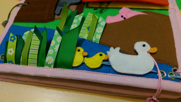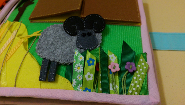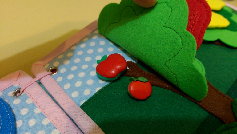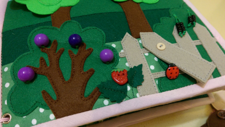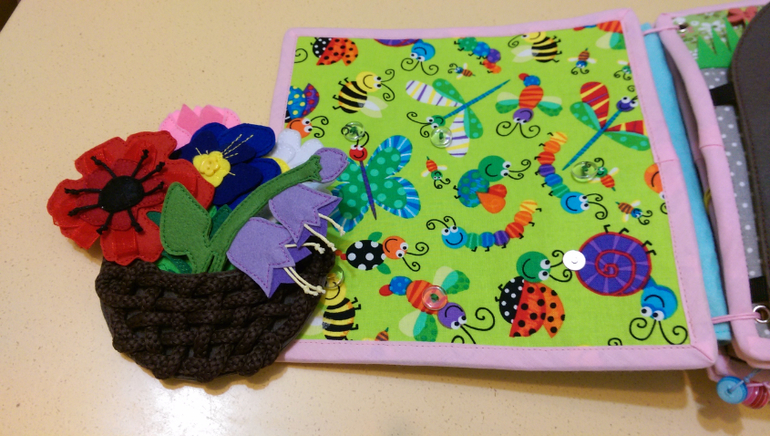На первой странице у нас цветочная полянка, где растут: ромашка, мак, тюльпан, колокольчик и Анютины глазки. Собираем цветы в корзинку.(Цветы на пуговицах, корзина на кнопке).