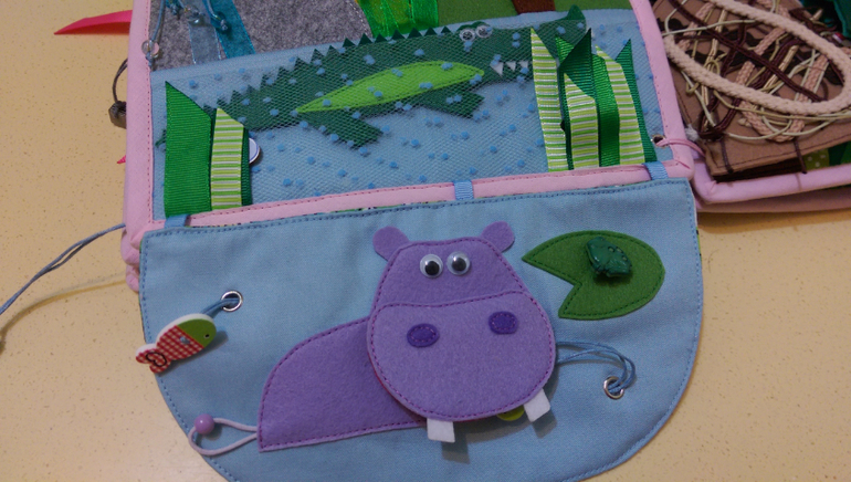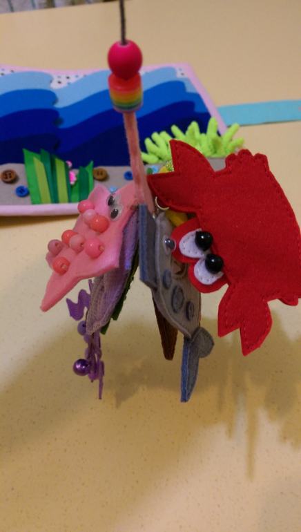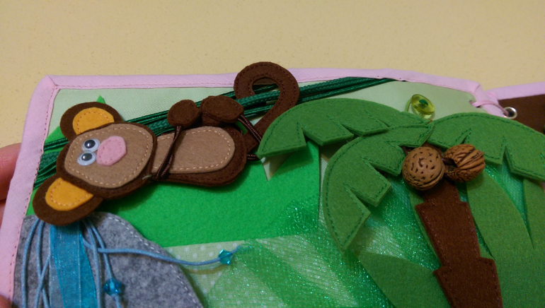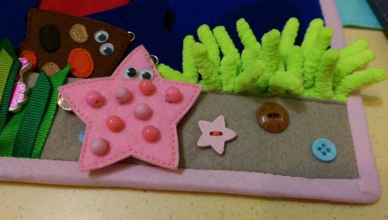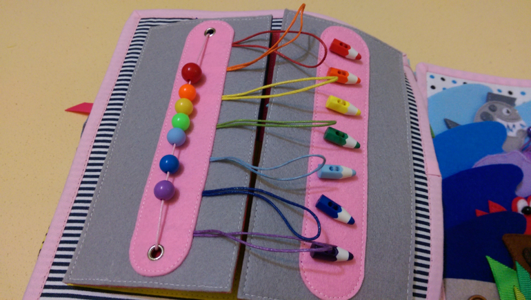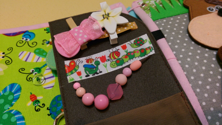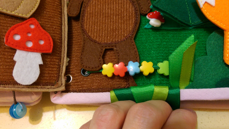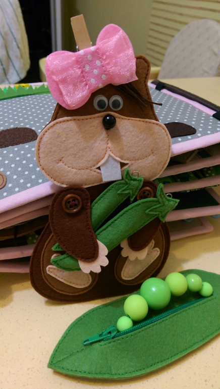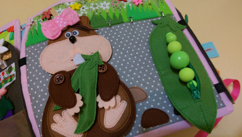 Вешаем горох на крючки. В большом горошины на резинке, можно подергать, а в поменьше прощупываем, пытаемся сосчитать.